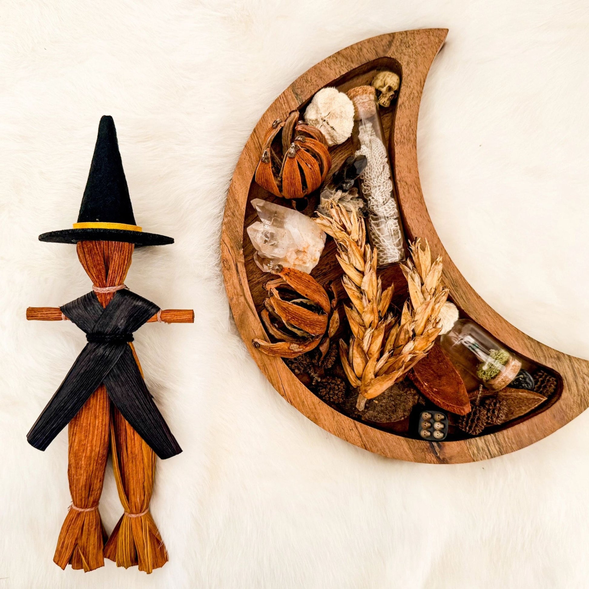 Use this Halloween colored Corn Husk Doll as a ritual poppet, a tool for sympathetic magic, or as a meaningful piece for your altar, especially during harvest festivals and seasonal celebrations. It also makes a powerful protective charm and a striking piece of witchy home décor.