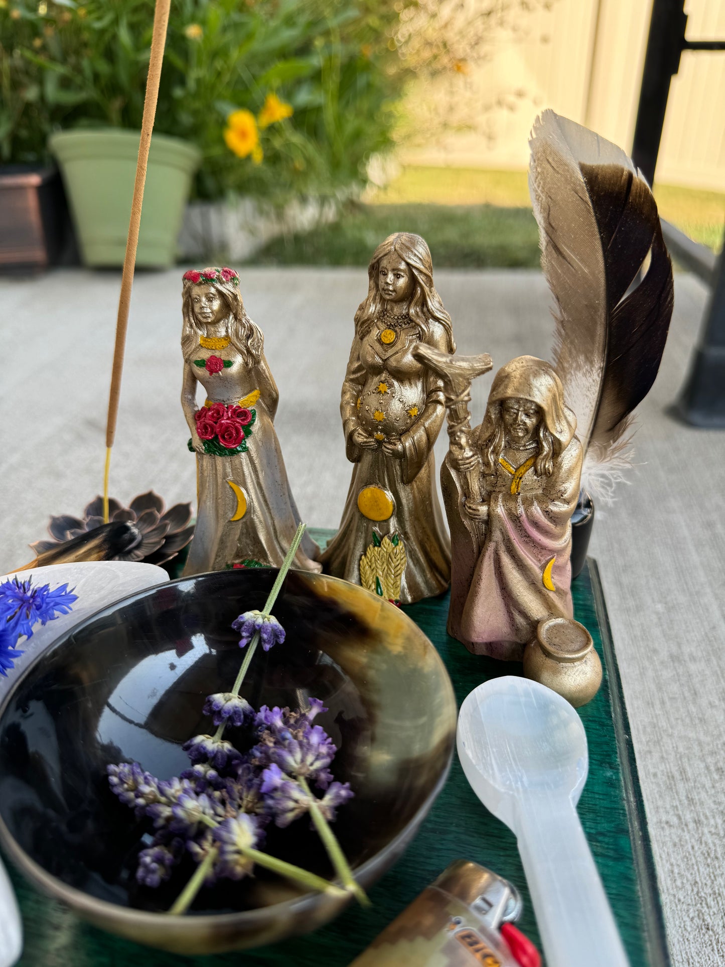 These figurines symbolize the three powerful phases of womanhood: the fresh, hopeful Maiden, the nurturing, grounded Mother, and the wise, intuitive Crone—a beautiful reminder of growth, transformation, and feminine strength.
